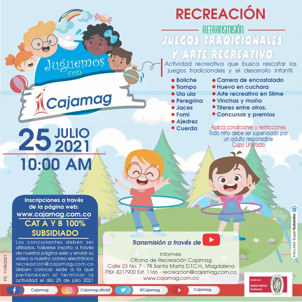 La oficina de Recreación Cajamag tiene programado la retransmisión de la actividad recreativa ‘Juguemos con Cajamag’, un espacio que busca rescatar los juegos tradicionales y el desarrollo infantil de nuestros niños afiliados.