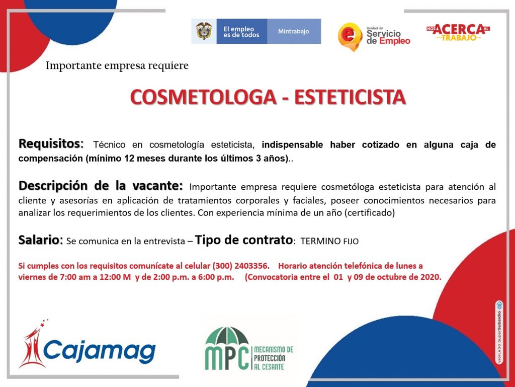 Convocatoria MPC – Cosmetóloga / Esteticísta Si cumples con los requisitos, comunícate al celular (311) 3945085. Horario de atención telefónica: Lunes a viernes de 7:00 a.m. a 2:00 p.m. También, puedes enviar tu hoja de vida al correo electrónico: [email protected] Convocatoria entre el 02 y el 09 de Octubre de 2020