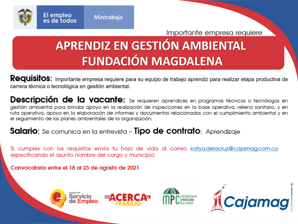 #ConvocatoriaCentroDeEmpleo | Importante empresa requiere: APRENDIZ EN GESTIÓN AMBIENTAL – FUNDACIÓN, MAGDALENA