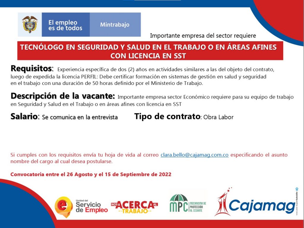 #ConvocatoriaCentroDeEmpleo | Importante empresa requiere: TECNÓLOGO EN SEGURIDAD Y SALUD EN EL TRABAJO O EN ÁREAS AFINES CON LICENCIA EN SST