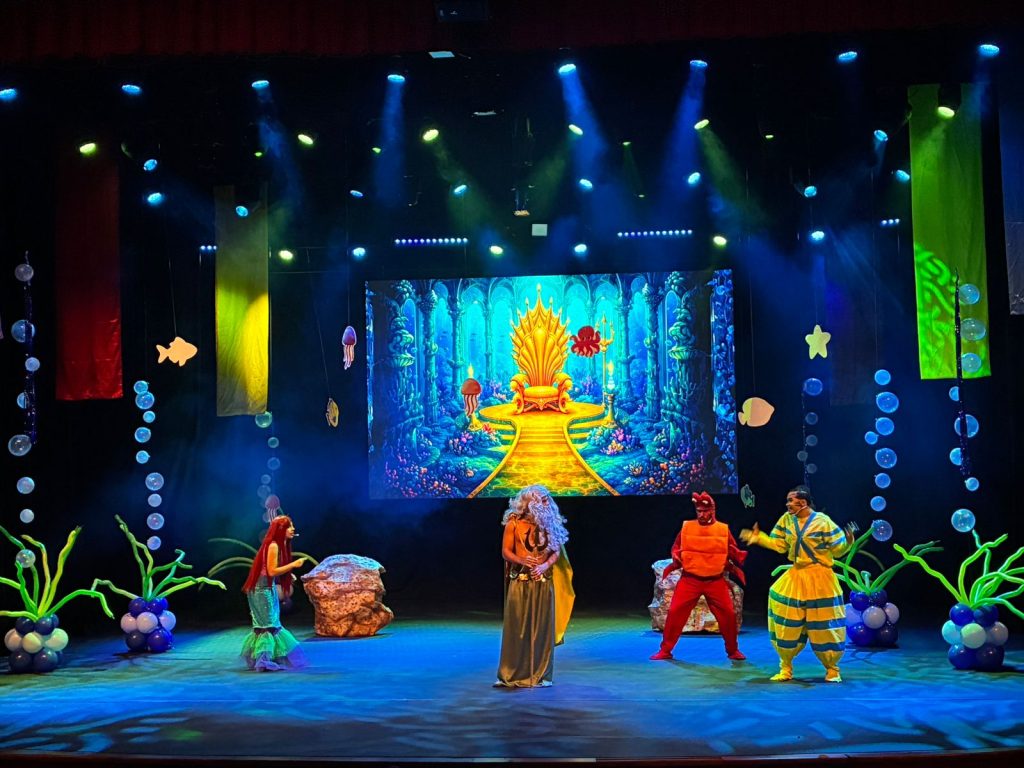 Desde que se abrió el telón, el teatro se llenó de color, música y emoción. Los personajes del clásico cuento cobraron vida en el escenario con coreografías dinámicas, canciones y una escenografía que recreó el mundo submarino donde se desarrolla la historia.
